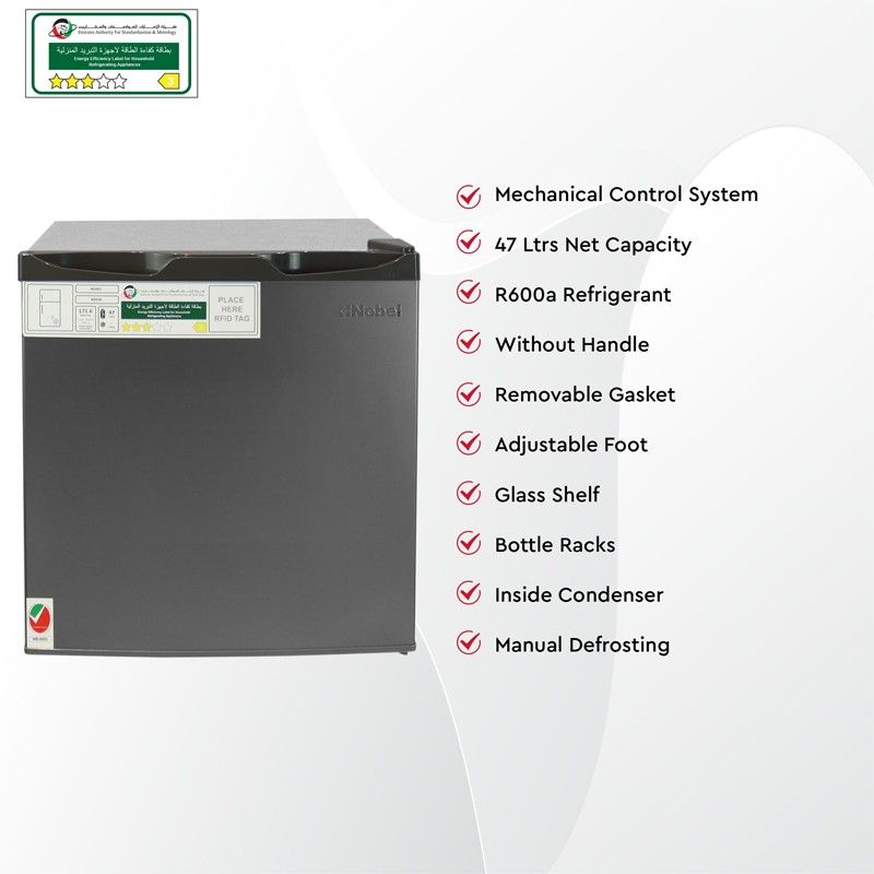 The Nobel 47L Single Door Refrigerator is a compact and practical solution for small spaces such as offices, dorms, or bedrooms. With a net capacity of 47 litres, it offers convenient storage for drinks, snacks, and small food items. Designed with energy-efficient cooling, this fridge keeps your items fresh while minimizing electricity usage. Its sleek dark silver finish adds a modern touch, and the durable build ensures long-lasting performance.